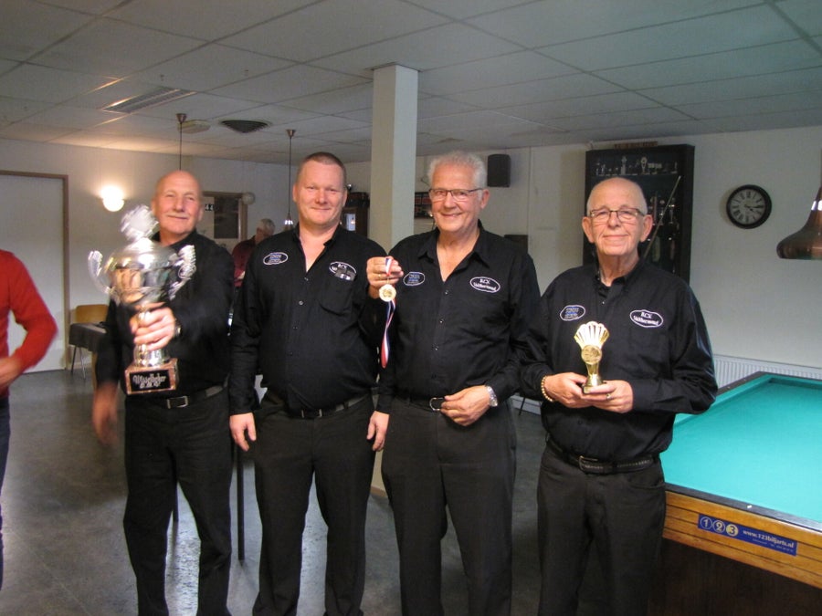Finalisten PK district finale 3 banden 1e klas, van links naar rechts, 1e plaats Derk Blauw, 2e plaats jaap Middel 3e plaats cor elzenaar, 4e plaats wim jekel